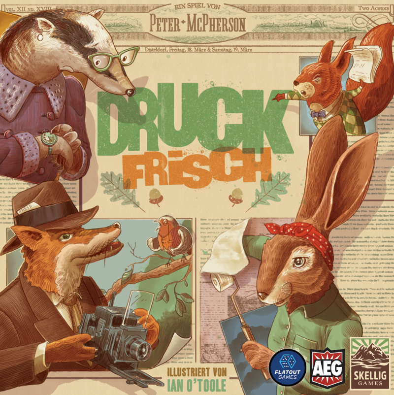 Druckfrisch ist ein Plättchen-Puzzlespiel über die neuesten Schlagzeilen von Peter McPherson, inmitten einer liebevollen Waldszenerie illustriert von Ian O’Toole!
